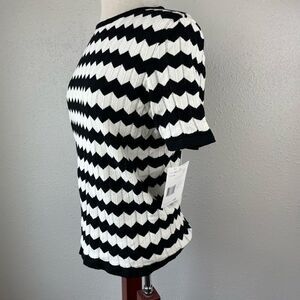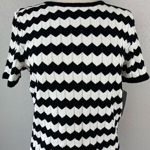 Love the contrast on this light weight deco graphic sweater top by Liz Claiborne. It measures 18 inches armpit to armpit laying flat and 24 inches in length from shoulder to hem.