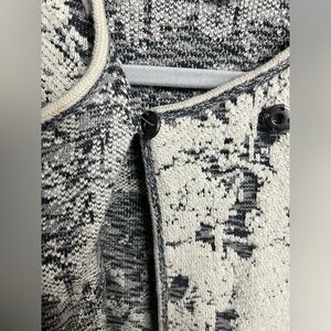 Creamy white and shades of gray, long sleeve, topper jacket made by J. Jill in size Small. Gray, striated areas are inset to the white areas which "stick out" slightly-2 snap buttons at the front neckline as well as 2 hand pockets.