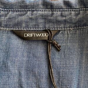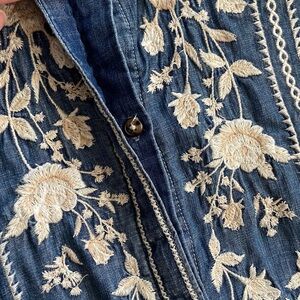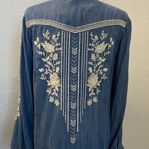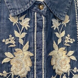 DRIFTWOOD Blue Denim Top with beautiful floral embroidery pattern. Size M. NWT