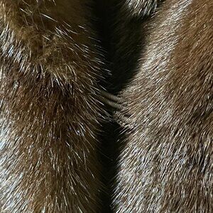Genuine Mink Coat - dark brown with hook-and-eye front closure. Mid-length 37". Gently worn with no visible imperfections (no fading, no thining). The coat has been cleaned and well maintained. It is stored in a garment bag in a cool area with no smoke or pets. The garment bag pictured is included in the sale. This is a beautiful coat- very rich color and extremely soft! Purchased at The Fur Centre, a St. Louis Mo boutique. Purchased in the 70's by my Aunt. Size Large
