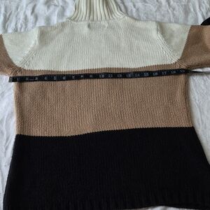 Chic crewneck sweater with a color block design. Features white, tan, and black sections. Ideal for versatile styling.