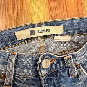Classic and versatile women's Gap Slim Fit jeans in a flattering medium wash. They feature a comfortable mid-rise and a slight bootcut leg opening. Perfect for casual, everyday wear or dressing up.