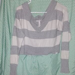 Stylish V-neck sweater. Features gray and cream stripes. Perfect for casual wear. OMG!!! This was my go to for so long. It was my favorite for a long time. It's comfy, it sits right, its cute, it's just everything. still in FANTASTIC CONDITION.