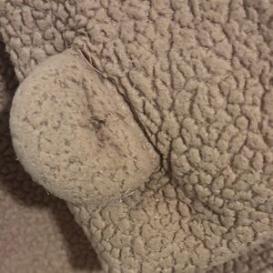 This item has been worn. Still soft and warm but not as fuzzy as it was new. No holes or stains I am aware of. Normal wash wear. The front right side by the bottom stitching has come undone, can be fixed. Zipper works well.