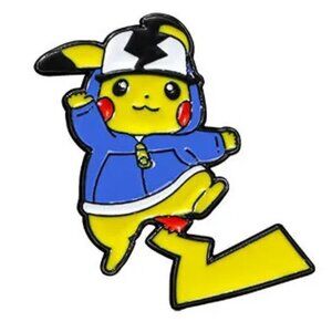 Adorable enamel pin featuring a yellow electric-themed creature jumping with a lightning bolt while wearing a blue hoodie and a hat with a bold black symbol. Perfect for fans of cute animated designs, cosplay-inspired accessories, or collectors who love energetic, colorful pins.