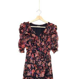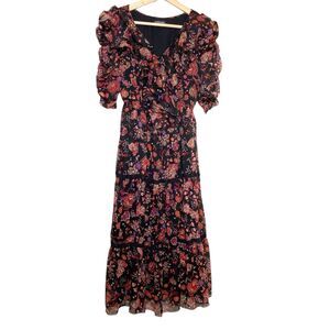 Antheaa Womens Medium Floral Midi Dress Ruffle Sleeve Tiered Pleated Puff Sleeve