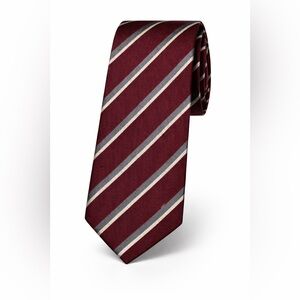 Stylish tie by Original Penguin. Rich burgundy with sleek white and gray stripes. Perfect for any occasion. A true classic pattern and color combo you can’t go wrong with! 100% silk