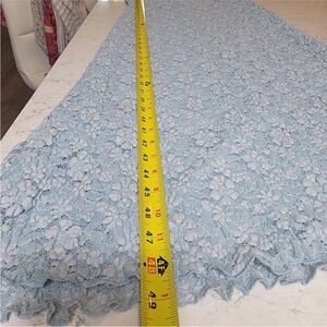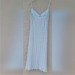 Chic lace midi dress in light blue. Features a fitted silhouette and delicate straps. Ideal for elegant occasions.