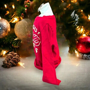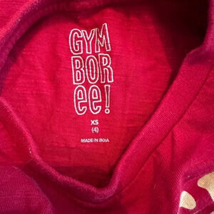 Gently-used, size extra small 4 long-sleeve shirt made by Gymboree. The shirt features a red color with gold/cream wording that reads "this guy with hands pointing inward loves presents." In good condition, the shirt has long sleeves and comes from a smoke-free, pet-friendly environment.