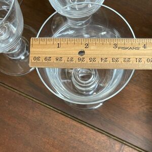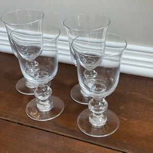 Four gently preowned William Yeoward “Lindsay” pattern water goblets. Use as oversize wine glasses or iced beverage glasses, whatever your occasion calls for! Each glass stands just over 7” tall. No chips or cracks. All marked with etched makers mark on bottom.