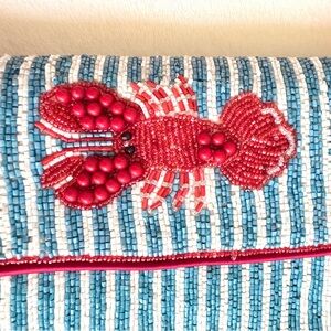 This Viral Beaded Light Blue & White Striped Lobster Bag is such a fun accessory to add to your wardrobe! Very STAUD inspired and so chic! It's brand new with tags and in excellent condition! Since it's lovingly handcrafted, each bag has unique minor imperfections that give it character. Comes with an adorable matching beaded lobster bag charm!