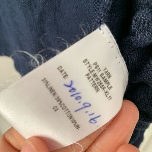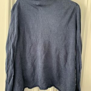 Women’s navy ruffled Lafayette 148 shimmer cardigan sweater, size medium, pit to pit approximately 20 inches, shoulder to bottom approximately 27 inches, sleeve length approximately 21 inches, both sides have a hole on them at the bottom front, barely noticeable when wearing, but it’s a slight flaw-Pictured, and priced accordingly.