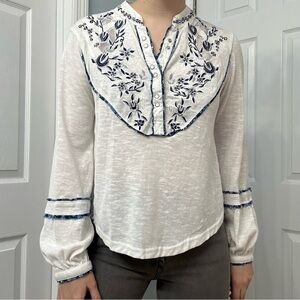 Free People Blouse Embroidered Floral White Blue Boho Dainty Size Extra Small