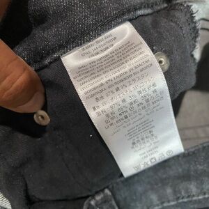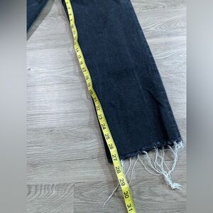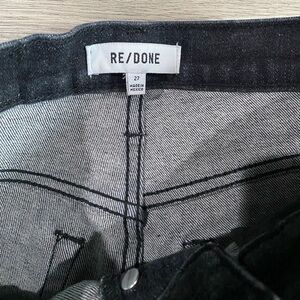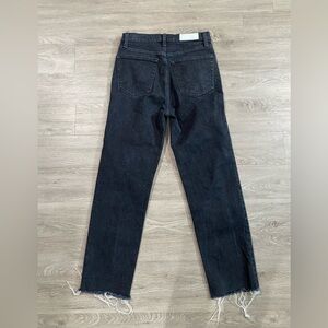 Chic high rise jeans by Re/Done. Sleek black finish. Perfect for versatile styling. Excellent condition. Intentional distressing at the hem. Button fly closure