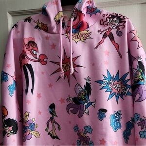 Vibrant pink hoodie with comic-style graphics. Features bold and colorful designs.
