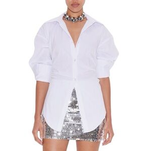 Chic white button down shirt. Unique back tie detail. Perfect for stylish layering.