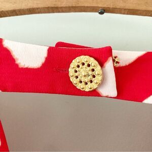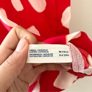 Anthropologie Leifsdottir silk red with white polka dot dress with short puff sleves with peekaboo opening from shoulder to hem. Unlined, empire waist, v neckline with keyhole opening joined by large gold antique button at neckline.