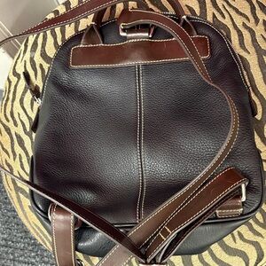 Elegant black w dark brown straps backpack featuring a stylish logo. Ideal for daily adventures.