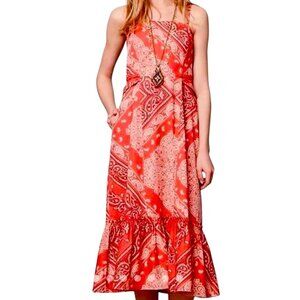 Anthropologie Strapless Bandana Ruffle Midi Dress, Pockets, Red Orange, 4