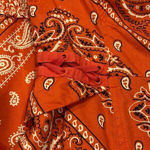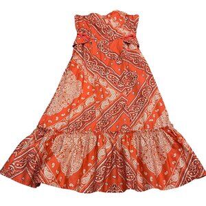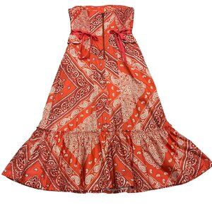 This Holding Horses strapless midi dress features a bandana print in an orange-red shade, zip back with ruched elastic, side detail with ties, hand pockets, and a large ruffle hem. Excellent condition, soft orangey-red, size 4