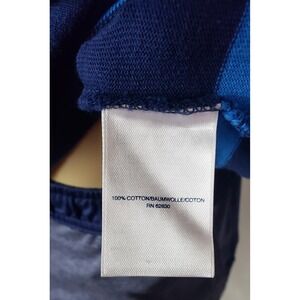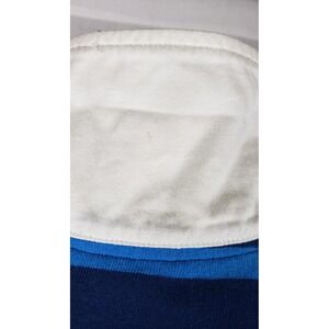 Color: Navy blue base with lighter blue horizontal stripes and white collar.