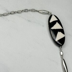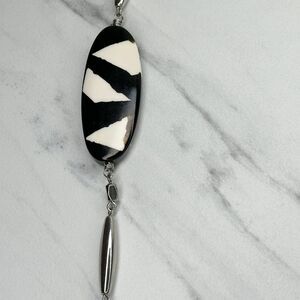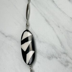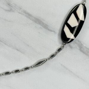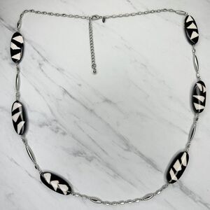 Absolutely gorgeous Chico's statement necklace with the most striking black and white geometric pattern! The oval beads have such a bold, modern design connected by sleek silver-tone chain links. At 46 inches long, this piece is so versatile - wear it long for a dramatic look, double it up for layering, or even wrap it multiple times for a choker effect!