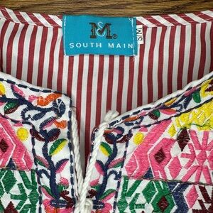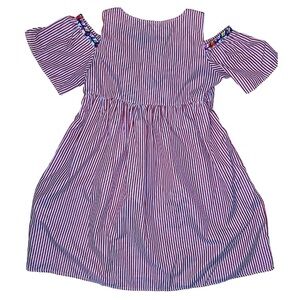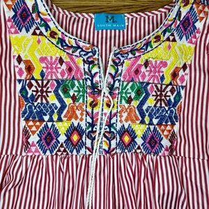 This charming dress features a vibrant multicolor embroidery on a striped pattern. Perfect for any occasion, it combines style and comfort effortlessly. In great condition!