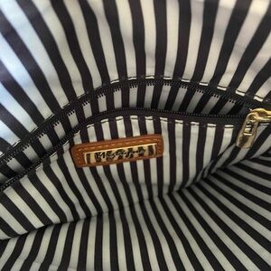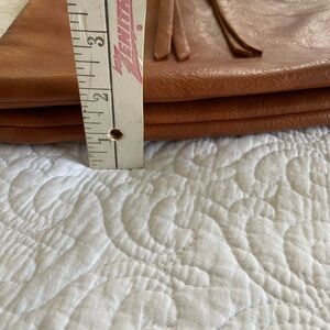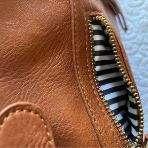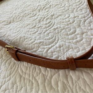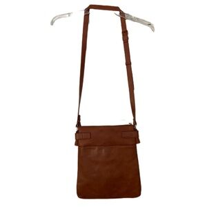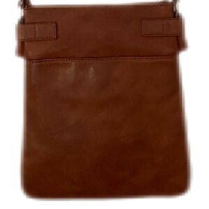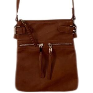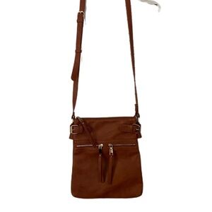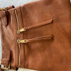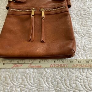 Miztique saddle brown color large crossbody bag. Striped interior. Vegan leather. Used only a couple times. Excellent preowned condition with no flaws.