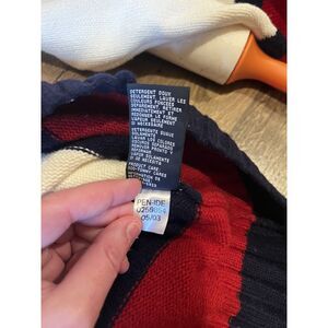 This Vintage Tommy Hilfiger Cream and Red V-Neck Sweater in XL size is a classic piece made from 100% cotton knit fabric. The sweater features a stylish V-neckline, long sleeves, and the iconic Tommy Hilfiger logo accent. Perfect for casual occasions in the winter and fall seasons, this vintage sweater is machine washable for easy care. The rich red color adds a pop of color to the cream sweater, making it a versatile and timeless addition to any man's wardrobe.