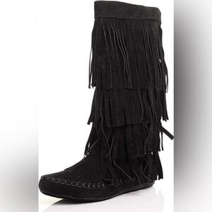 Stylish moccasin boots with fringe detail. Soft suede material. Perfect for a boho look.