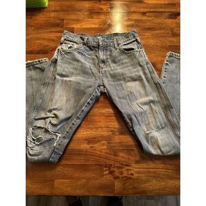Relive the classic vibes with these vintage Levi's 560 jeans for men. The blue denim fabric is sturdy and perfect for daily wear. The jeans feature a loose comfort fit straight leg style with a high rise waistline. Equipped with a zip closure, button accents, and a logo, these jeans have a 5-pocket design including a coin pocket. The tapered style and distressed features make it a perfect choice for summer, fall, and spring.