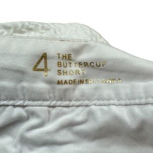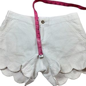 LILLY PULITZER: Buttercup Scalloped White Shorts. The Lilly Pulitzer Buttercup Shorts are the cutest little short in town. Solid short in garment-washed cotton wave jacquard. Sweet scalloped hem. Low rise. Flat front. Front trouser and seamed back welt pockets. Banded waist. Zipper fly and button closure. No holes, stains, or piling.
