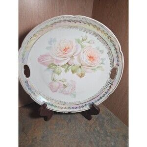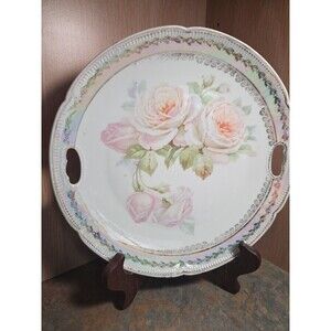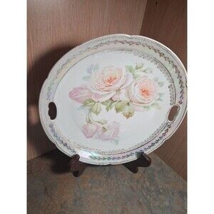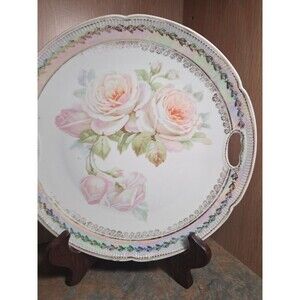 Antique Cabbage Rose on Green Luster Molded Double Handle German Porcelain Plate
