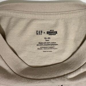GAP x Netflix Stranger Things crossover graphic t-shirt. “Greetings From The Upside Down” on front, “Stranger Things” on sleeve. GAP Teen size 18-20, in the color Moonstone, a beige. Worn once by my daughter to school for Halloween. No flaws, rips, stains, tears, etc.