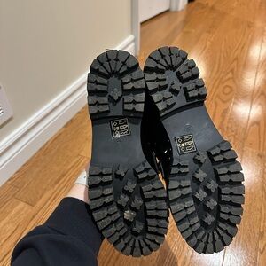 Elevate your wardrobe with these stunning black patent leather loafers. Featuring a chic gold accent, they offer both style and sophistication for any occasion. Only warn once.