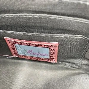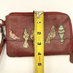 So cute! Five birds adorn the front of this adorable wristlet. 100% cotton with a protective coating on the exterior . Cotton interior is not coated. Four card slots, zips around top and one side, opens wide. Has side gussets to keep contents secure when open. Color is red with a brown tint.