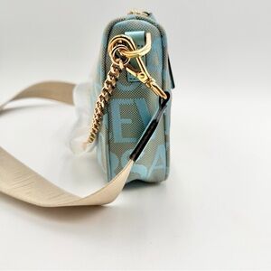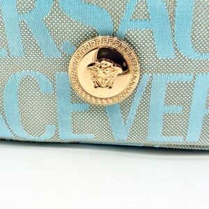 NWT Elegant Versace Shoulder/Crossbody in Blue & Tan with bold logo design. Features gold hardware and adjustable strap. Perfect for adding luxury to any look.