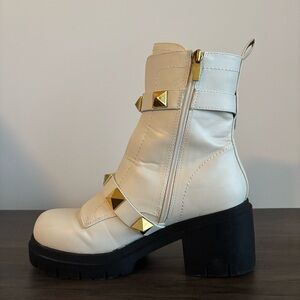Elevate your style with these chic cream ankle boots featuring striking gold accents. Perfect for any occasion.