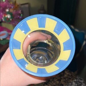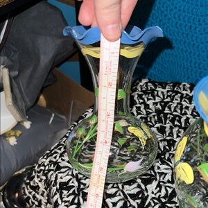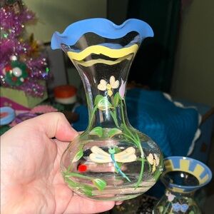 Each vase features hand-painted multicolor butterflies, dragonflies, and ladybugs with a blue and yellow striped rim.