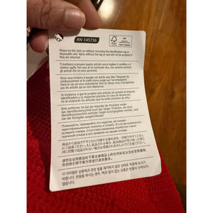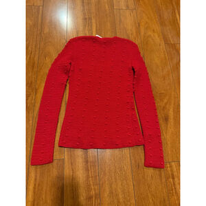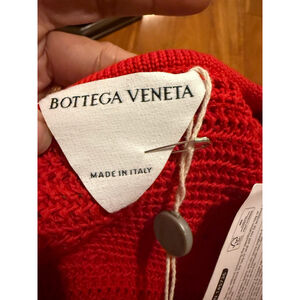 This is a new with tags Bottega Veneta women's red long-sleeve sweater, size S. It features a textured knit pattern with small, raised "pom-pom" like details throughout the body and sleeves. The sweater has a scoop neckline and is made of 100% cotton, with trimming/garniture of 92% cotton. Care instructions indicate it is made in Italy and should be hand washed or dry cleaned. The original retail price is visible as $1,413.00.