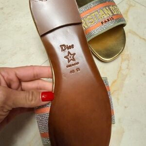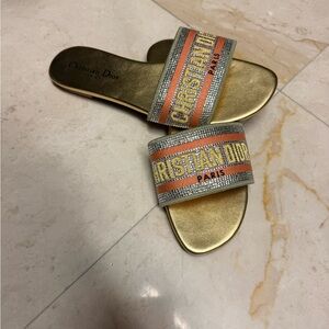Stylish Christian Dior slides with gold and silver tones. Features logo detailing.
