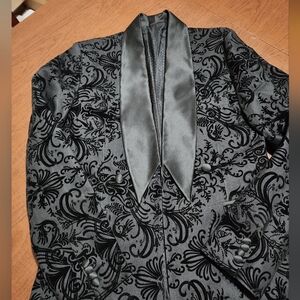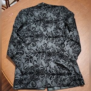 Stylish blazer with intricate black floral patterns on a gray background. Perfect for formal occasions. in excellent condition