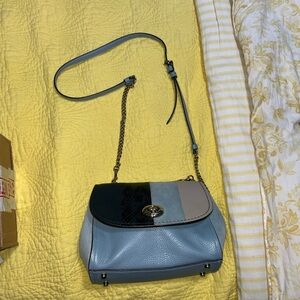Chic crossbody with a stylish two-tone look. Features a front zipper and adjustable strap. Perfect for daily wear.