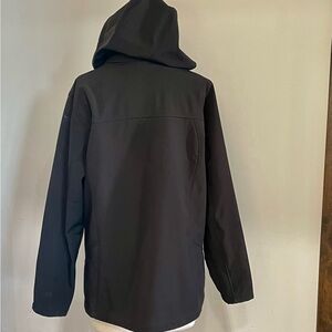Free country soft shell jacket with faux fur lining. Hood is removable. Multiple front pockets. Zipper closure on all. Adjustable arm cuffs. Water resistant. Excellent condition