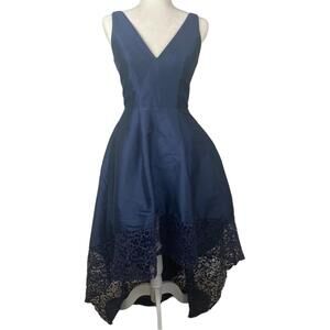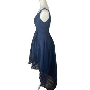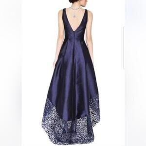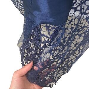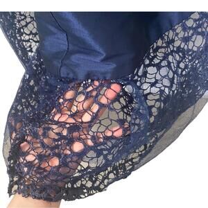 Monique Ihuiller high low gown dress navy blue elegant V neck lace detail US2