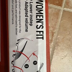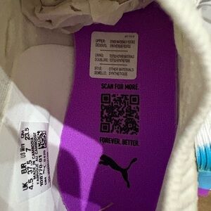 Dynamic Puma soccer cleats with striking purple and blue details. Ideal for active players. Sized specifically for women or youth. A bit tighter or narrower than unisex pairs.