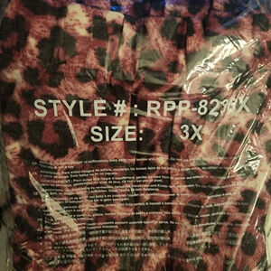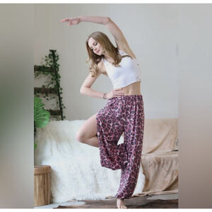Zenana women's split leg pants in a pink and black leopard print, size 3X. The pants feature a relaxed fit with an elastic waistband and gathered ankles. There is a high side slit on the legs, The fabric is soft and stretchy, suitable for casual wear or light activity. The item is packaged in a clear plastic bag with "STYLE#: RPP-8270X" and "SIZE: 3X" printed on Fabric content: 70% POLYESTER? 26% RAYON 4% SPANDEX.