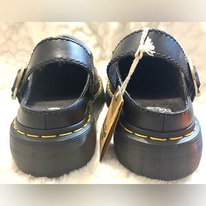 Sleek black leather slingback mules by Dr. Martens. Unisex women’s size 7 men’s size 6. Sling can be worn on top of foot or back of ankle. Iconic style with durable construction. archive-inspired mule with a chunky platform sole. Packed with the spirit of the original 90s sandals Built from rugged Atlas leather, detailed with an antique gold branded buckle and Dr. Martens rivet and signature yellow stitching..Atlas is a classic waxed aniline leather with a subtle pull-up and a slight sheen. Biker grunge punk goth