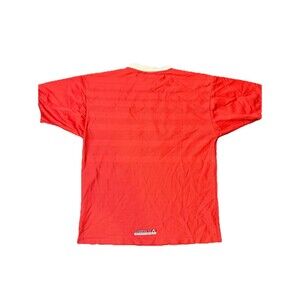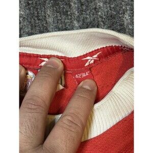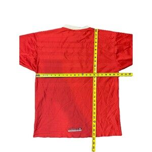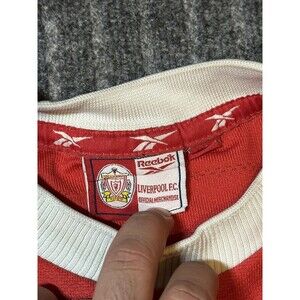 Show your support for Liverpool with this vintage 1998 Reebok soccer jersey. Made in Jersey, this red jersey features the Liverpool team name and is officially licensed. Perfect for any soccer fan, this jersey is a size 42/44 and suitable for men. Whether you're adding it to your collection or wearing it to the next game, this jersey is a must-have for any Liverpool fan.