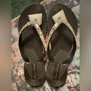 Elegant black flip flops with sparkling silver straps. Perfect for any occasion.